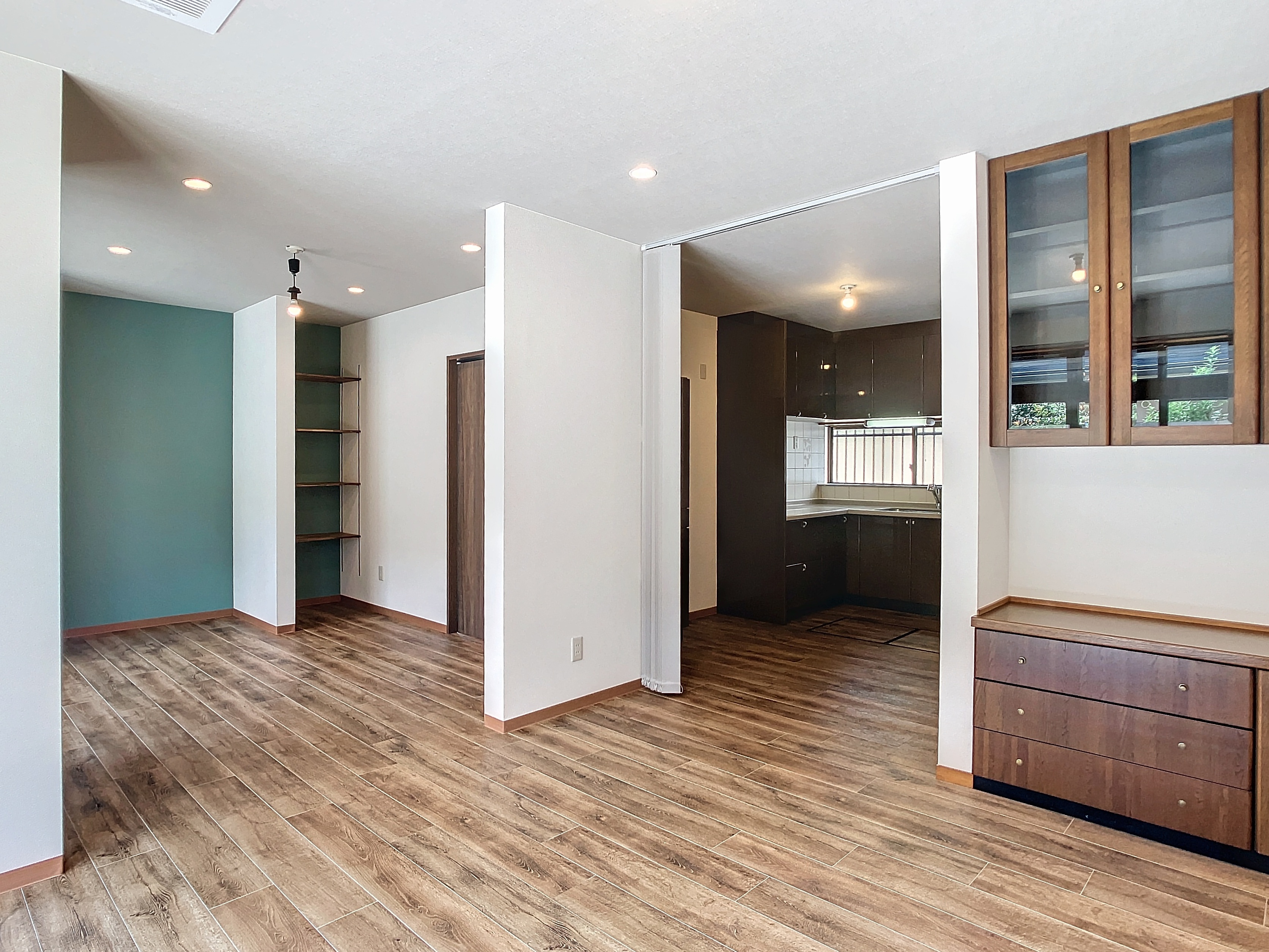 元々、LDKの横には6畳の和室があり、さらにその奥に洋室がありました。今回は、その和室を洋室化し、扉や壁の一部を撤去しLDKと一体化させる事でさらに広い空間としました。