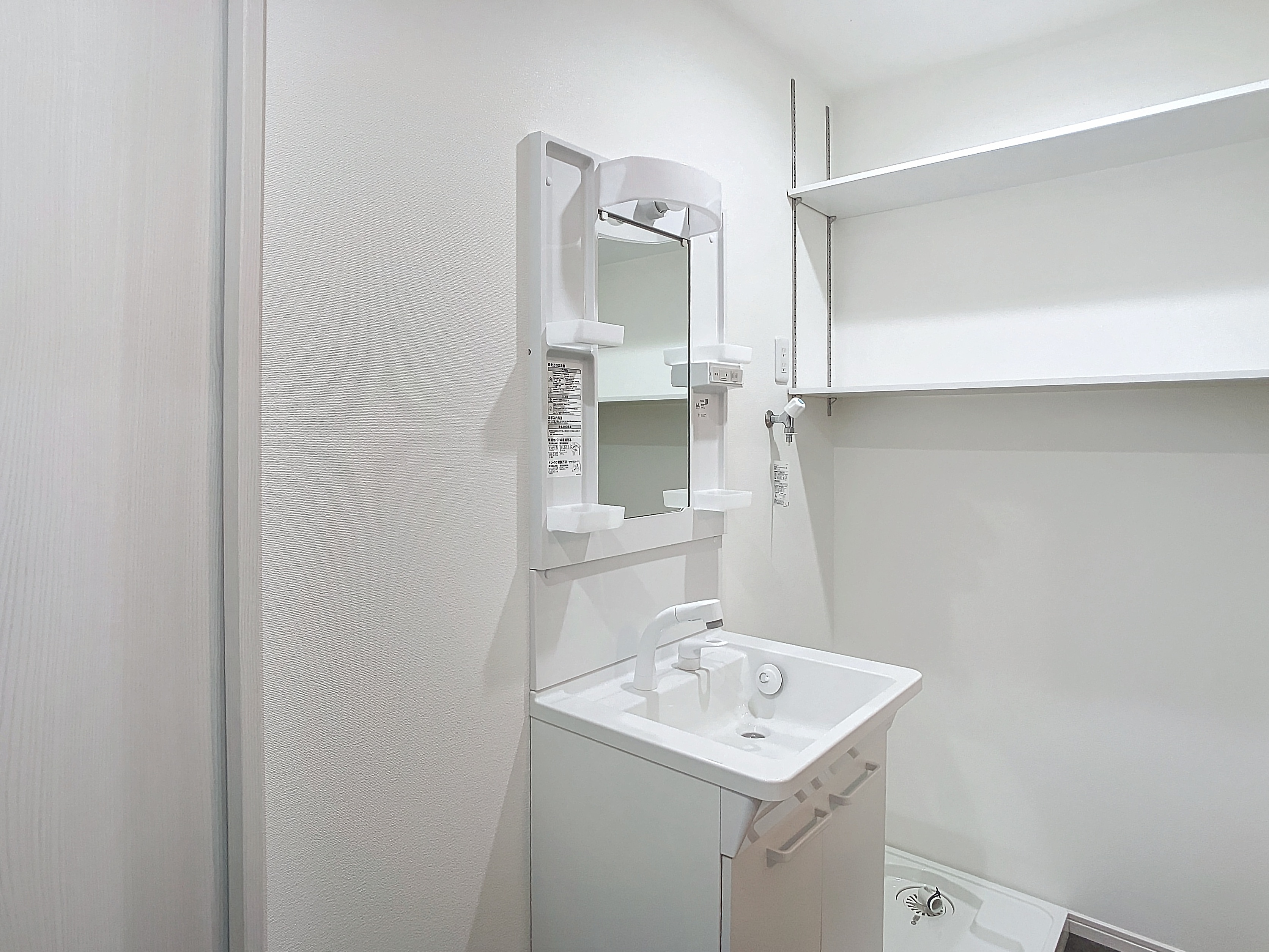 洗面台も交換し、洗濯機置き場上部のデッドスペースには可動棚を設置。
