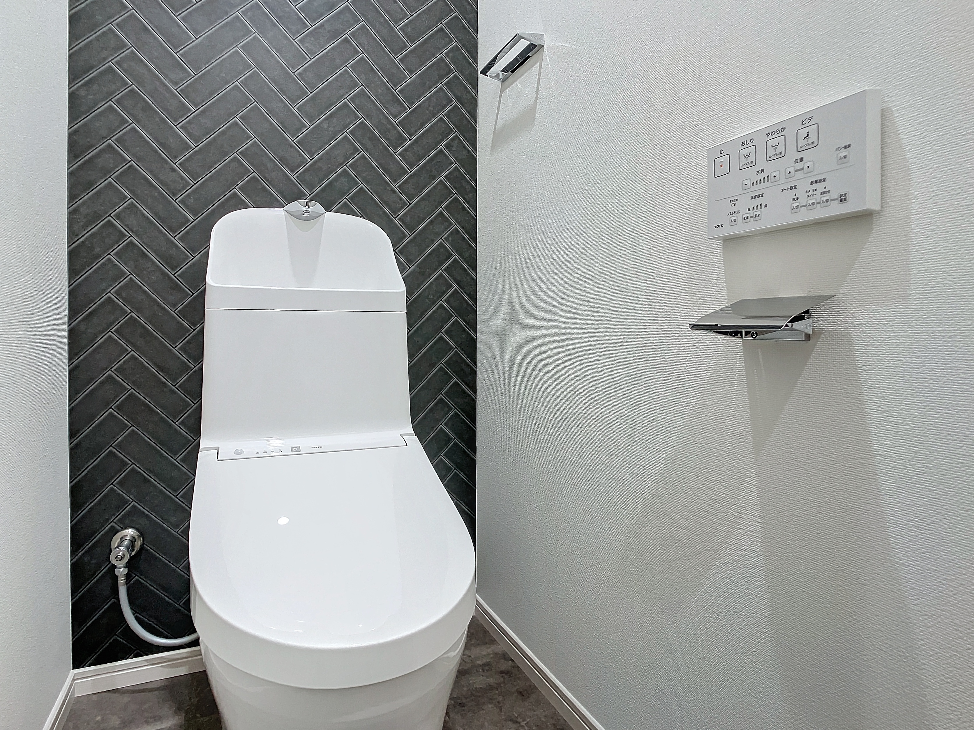トイレは、便座本体を交換し、奥にはアクセント壁紙を配し、タオル掛けやペーパーホルダーも一新。