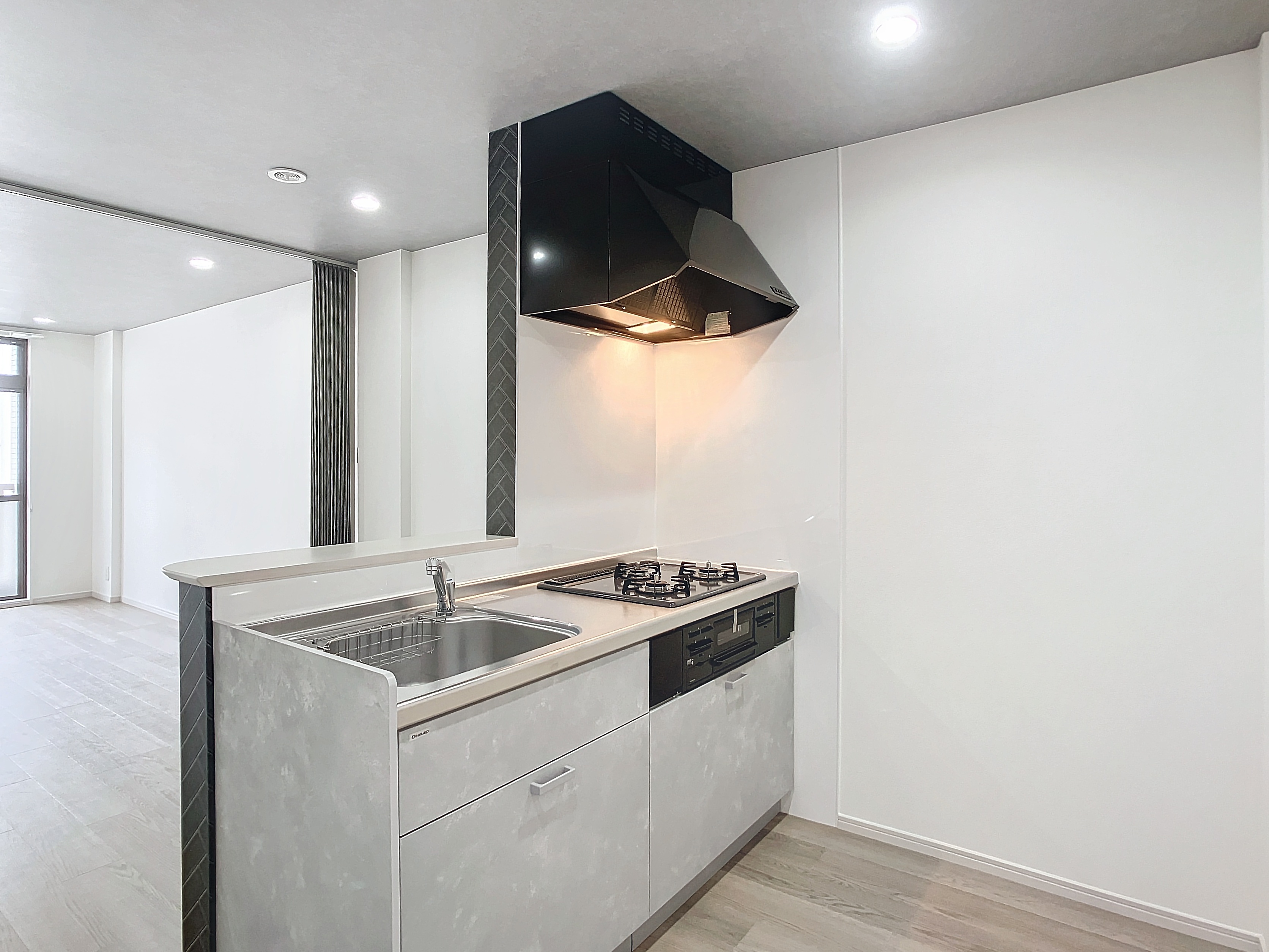 キッチンはカウンタータイプの部屋に調和した配色のシステムキッチン。