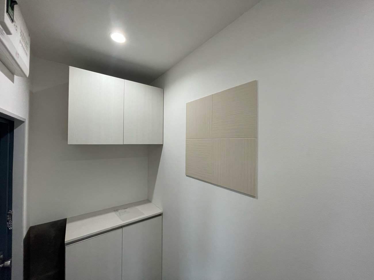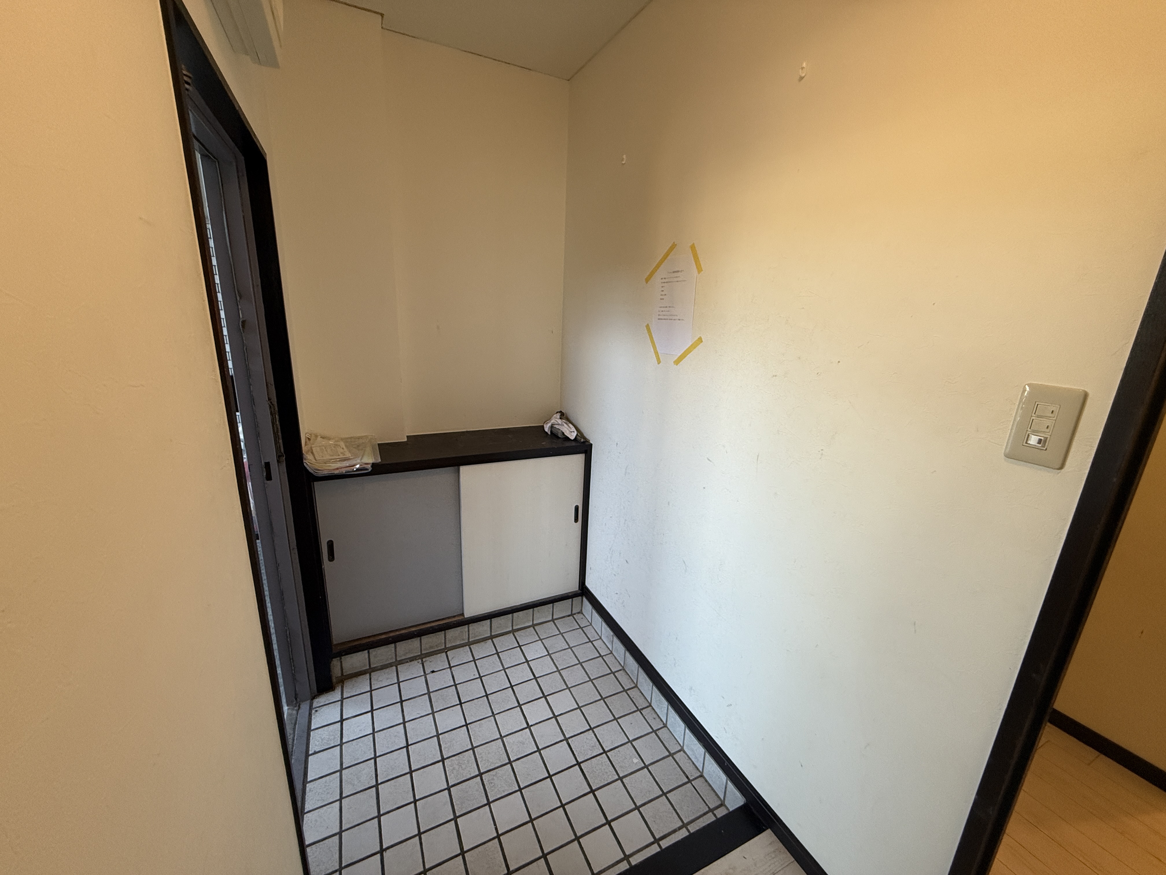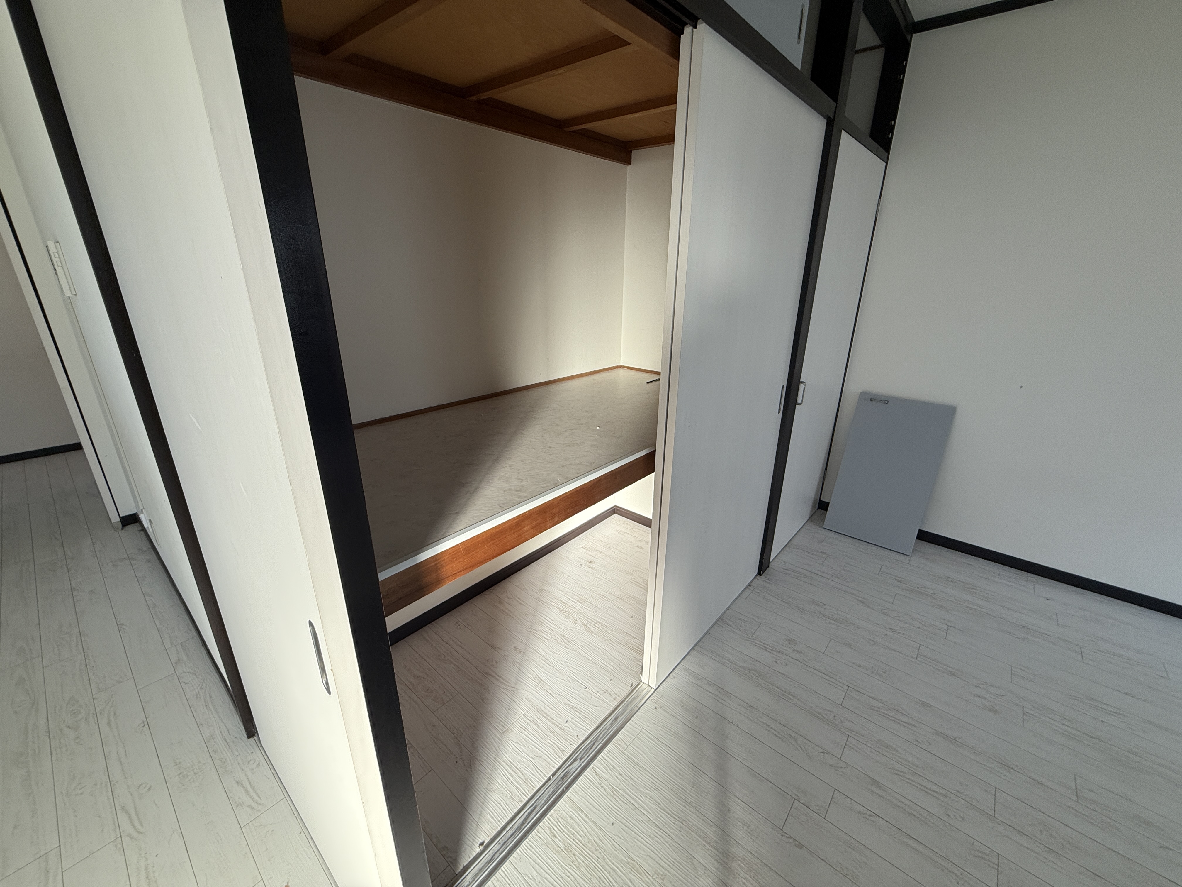 和室だった部屋を洋室化したものの、押入れの引違い戸は白いものに交換されているが、 天袋はグレー色のフィルムを貼り、全く色が合っていない他 押入れ内も白い板を貼っただけの中途半端な状態でした。