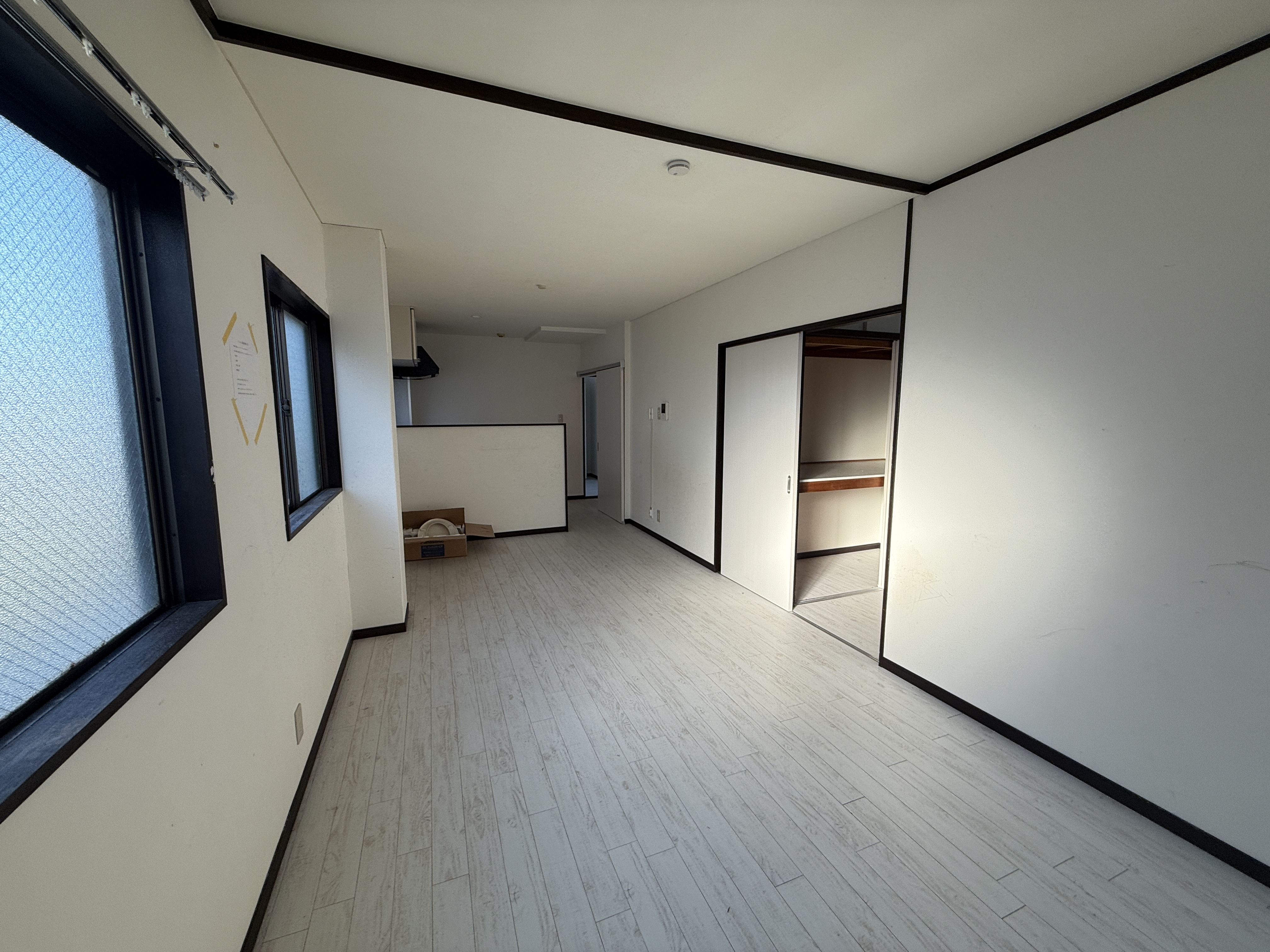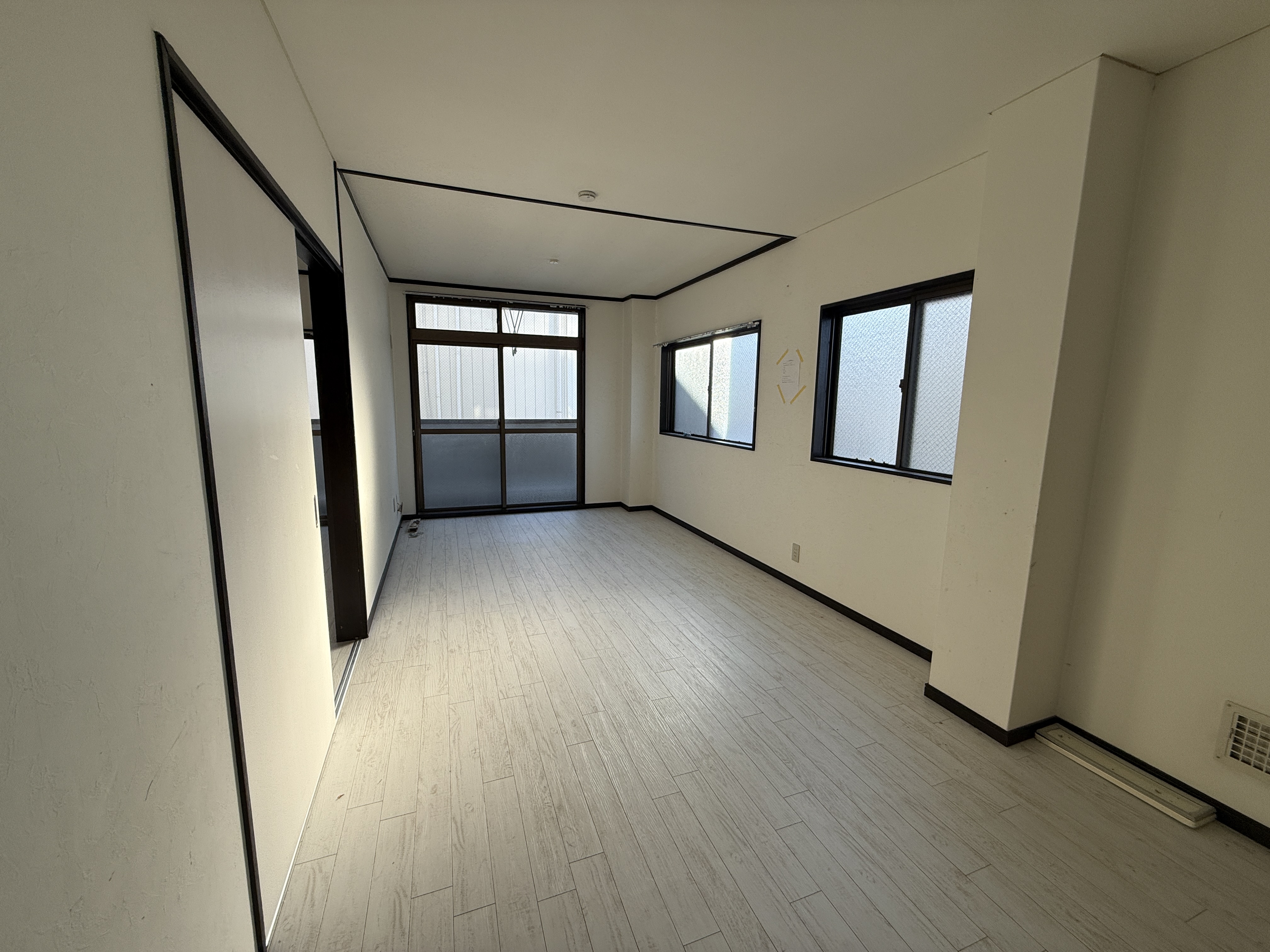 和室を洋室化し、DKとを繋ぎ広いLDKにしたものの、窓の木枠や巾木は古いまま、 元々和室だった天井の木枠処理をせず、LDKにしたものの謎の木枠が残ったまま…