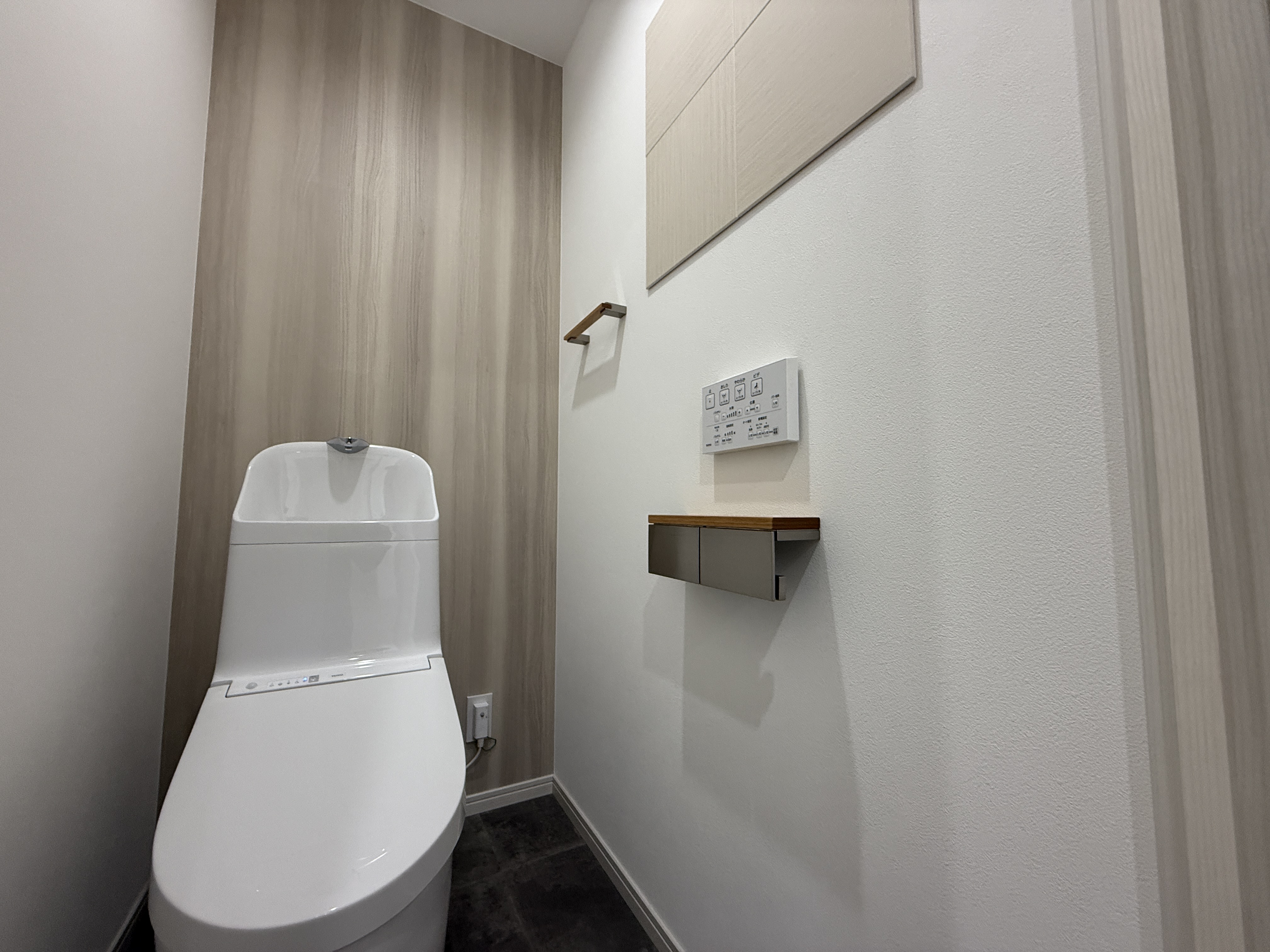 トイレは、便座本体を交換し、奥にはアクセント壁紙を配し、タオル掛けやペーパーホルダーも一新。