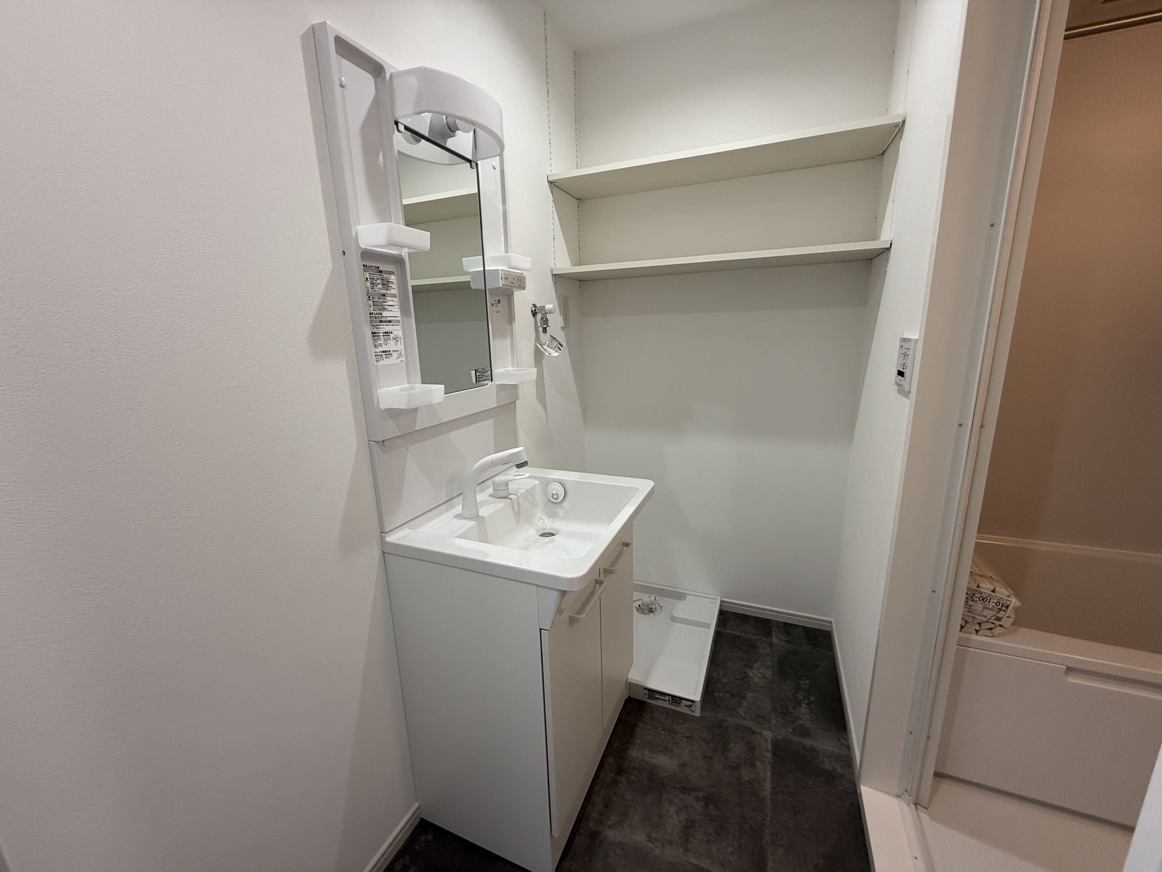 洗面台も交換し、洗濯機置き場上部のデッドスペースには可動棚を設置。