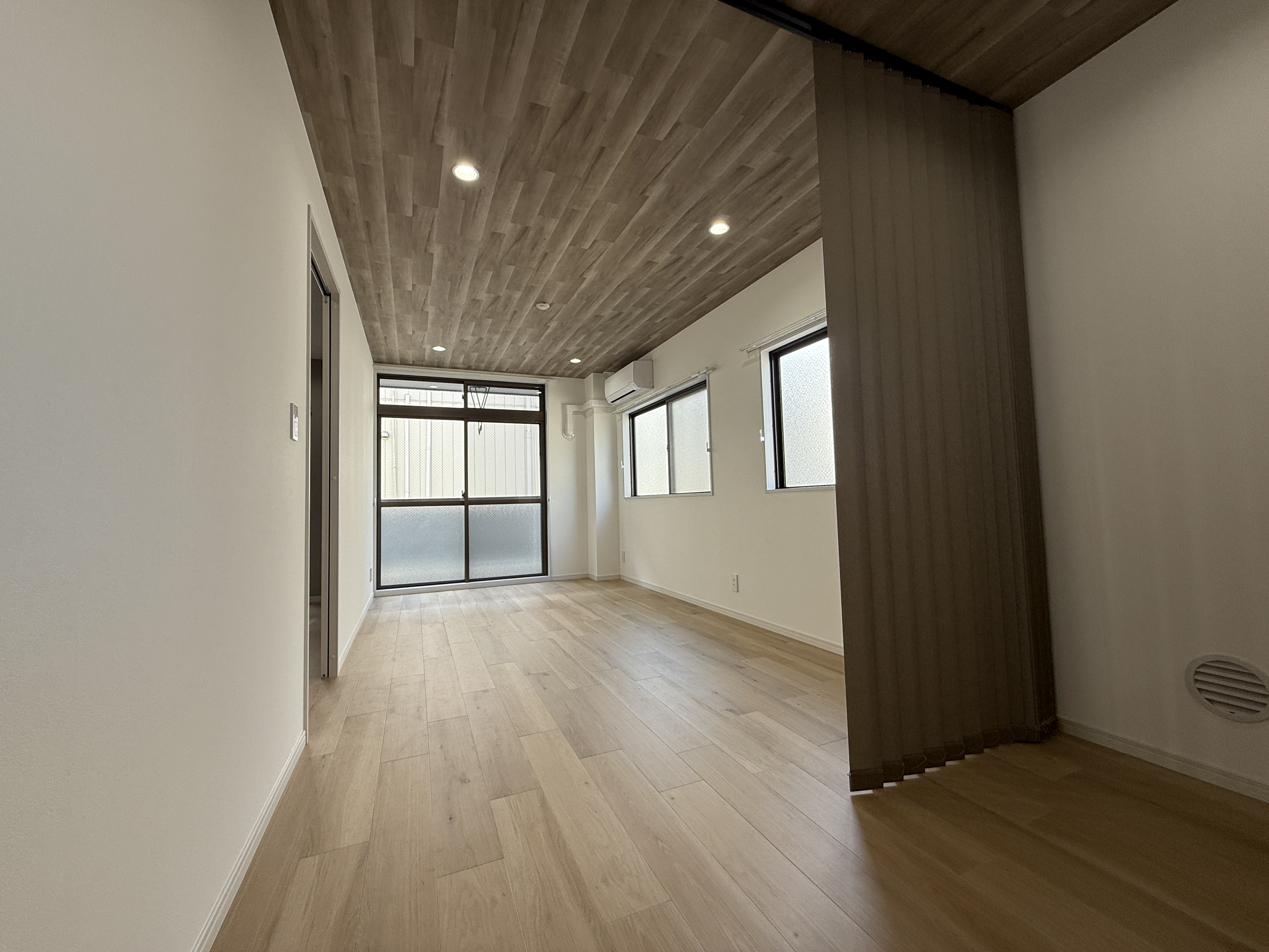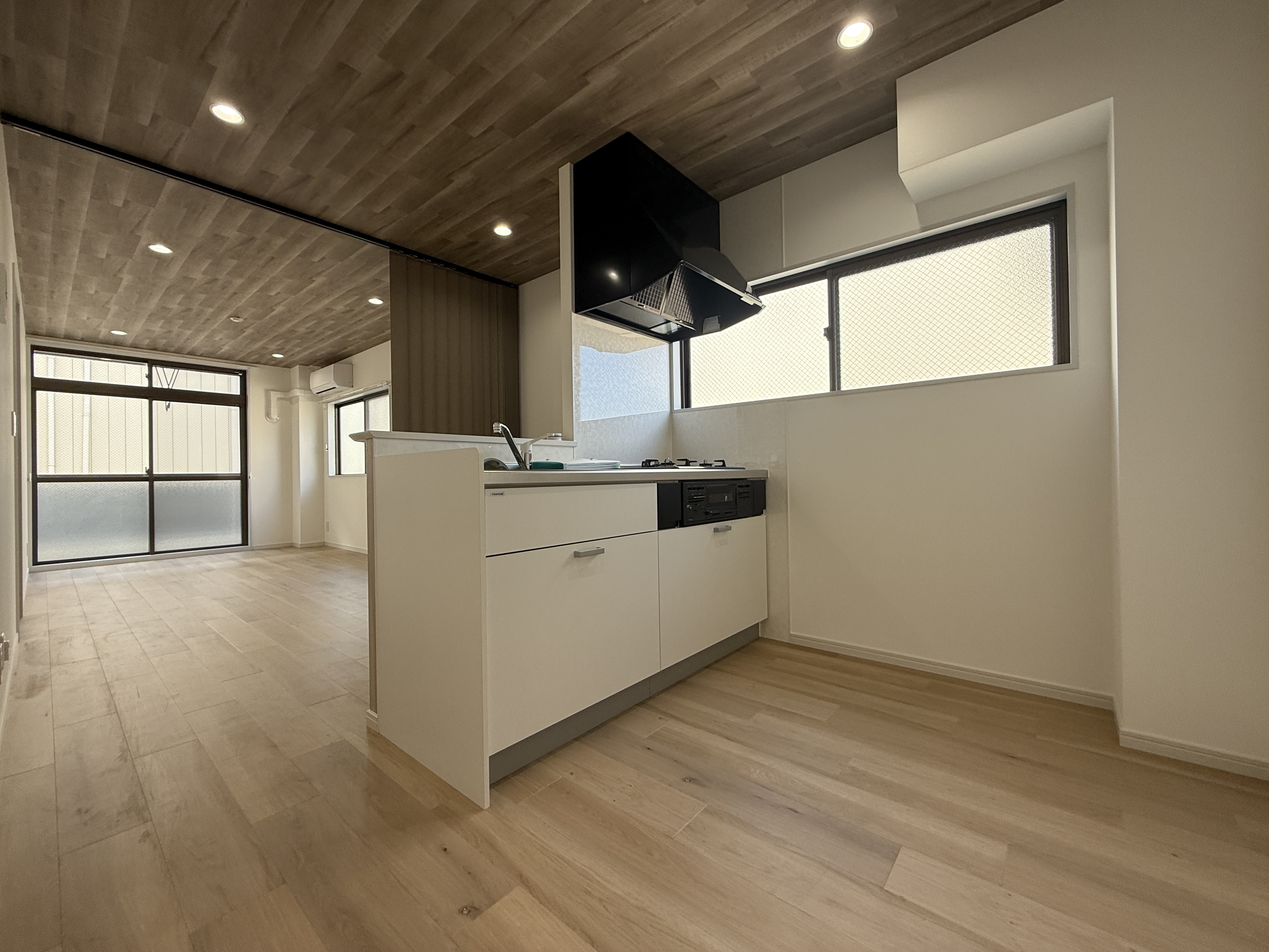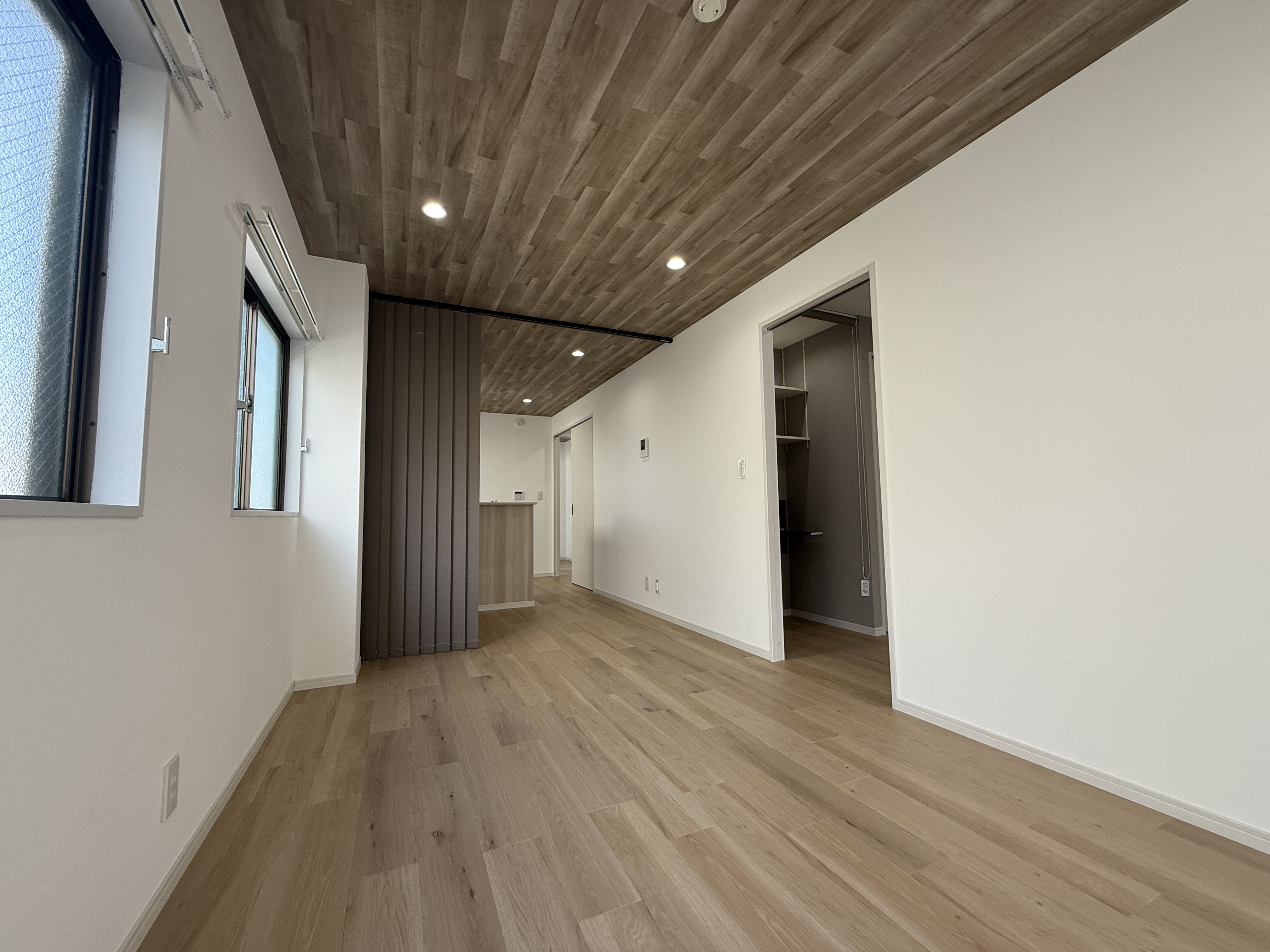 このような奥行きのあるLDKの場合、天井の壁紙を全て白にするより、このような木目のアクセントを入れる事でお部屋自体が締まった感じになります。
