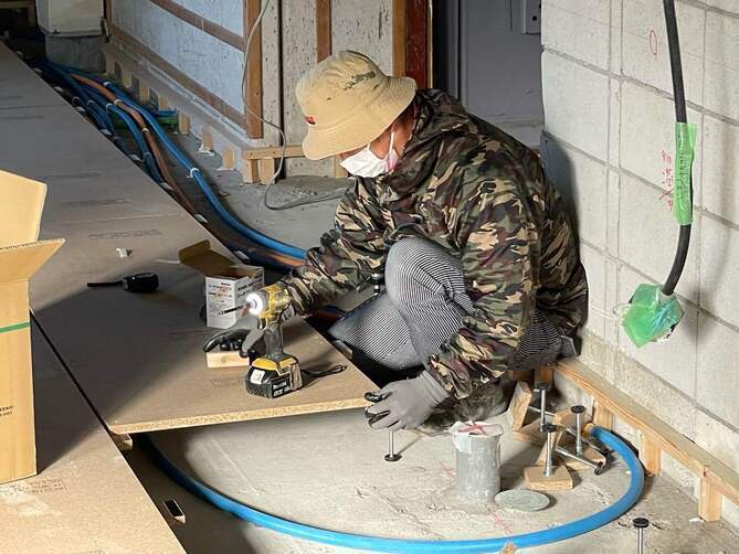 床は段差を解消し給排水管が通しやすく点検もしやすい置床工法で施工。