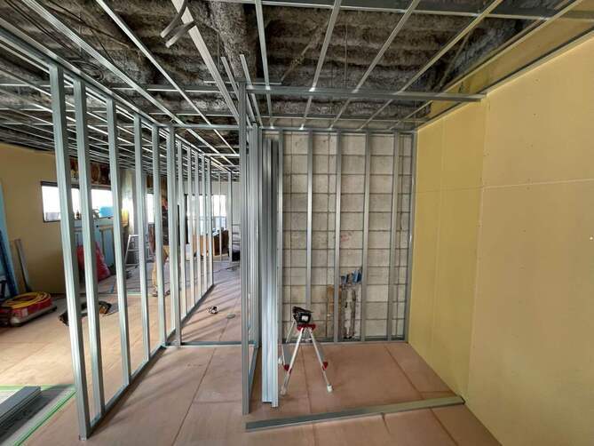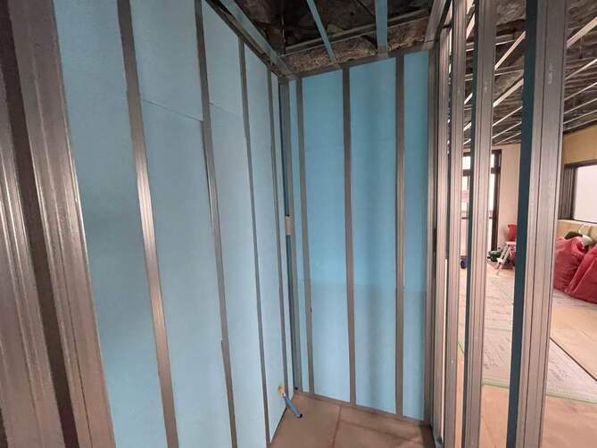 今回はアルミ枠で室内を施工し隣のお部屋への音漏れを軽減させる遮音シートを入れ、壁となる部分への断熱材もきちんと入れていきます。